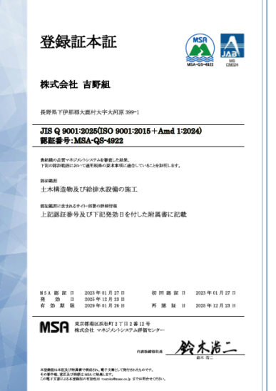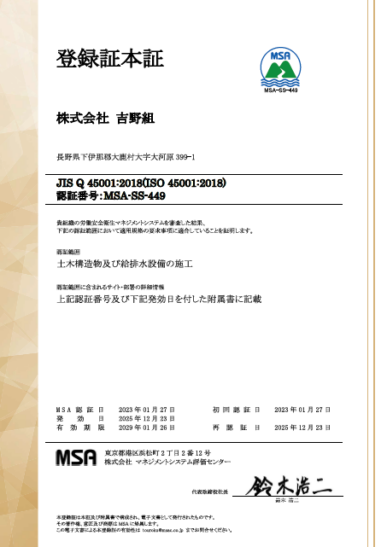 株式会社吉野組は、南信州、大鹿村を中心にして土木工事を主とする建設事業者として、地域に根差し地域住民の思いを実現できる企業として多様に変化する社会や環境へのニーズに対し、確かな技術と想像力・実行力で応えていけるべく、労働安全衛生および品質マネジメントシステムを確立し、継続的改善に努めます。